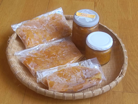 今はスマホで何でも調べられます。ザーッ見て、ざっくり理解。 スプーン何杯、〇〇グラムナンテ計りません。 味を見ながら〜足していけばいい! 皮はピーラーで剥く、細かく切る、3回あく抜きをする。 水を入れ(適当)果肉を全部土鍋に入れる。暫くして皮も入れる。弱火で煮詰めていく。 基本は三温糖と蜂蜜、エイッ隠し味にメープルシロップを少々入れてみました。 最後は塩ひとつまみ。私は甘ったるいジャムは苦手〜糖分は控え目。 12ケの夏みかんが土鍋一杯に。煮こぼれないように、焦がさないように 弱火で蓋をして煮る。時々味をみる。又煮る。開けてかき混ぜて味をみる。 又、蓋をするの繰り返し〜〜。 もう〜立っていたから疲れちゃって〜〜(笑) ガスレンジのそばに椅子を持ってきて煮詰める。 もしも、ひどく不味いママレードができても私が食べるんだからいいわ〜(笑) 4時間かかりました。心を込めてかき混ぜる。本当です〜(笑) 出来上がり〜結果は〜〜〜 ものすご-く、ウマイ!ヤッターァーと自己満足する。自画自賛!(笑) コレ、コレ!この苦味が好きなの! 少しずつおすそ分けしたいけれどケチになりそうなの〜(笑)